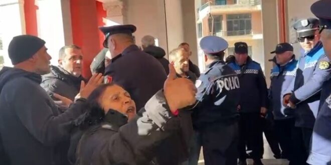 Qytetarët kanë tentuar të futen brenda Bashkisë dhe janë përplasur me policinë. Ata kanë goditur me bidona derën kryesore dhe kërkojnë takim me kryetaren e Bashkisë.