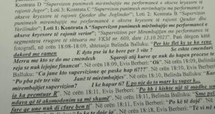 Përgjimet Në orën 18.02, Evis Berberi: Kuptova, i thotë. Në orën 18:05, Lubi Balluku: Ke një supervizion mirëmbajtje. Në orën 18:04, Evis Berberi: Po, më thuaj. Në orën 18:07, Lubi Balluku ka dërguar një fotografi si ajo nga sistemi elektronik i prokurimeve, në të cilat janë listuar procedurat e publikuara …